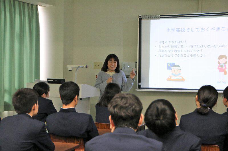 ホームカミング講演会では、山梨学院中学校・高等学校特進コースを卒業し、現在大学で学業に励んでいる現役大学生に来てもらい、中学生に分かりやすく話をしてもらっています。